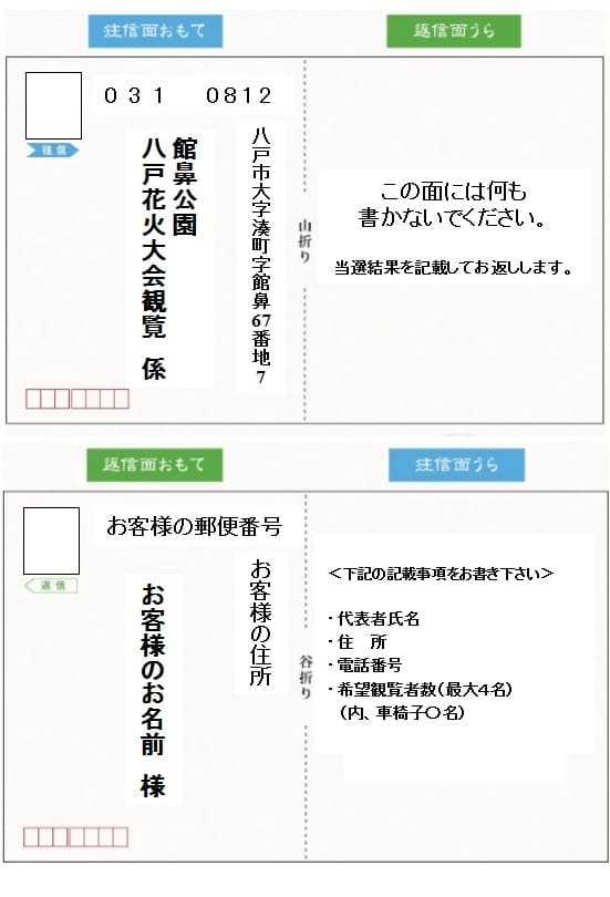 観覧スペースを決めさせていただきますが、応募者多数の場合は、抽選になります。希望者は、往復はがきに以下の必要事項を記入の上、お申込み下さい。