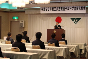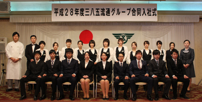 28年度のグループ合同入社式が八戸パークホテルに於いて行われました。三八五流通株式会社を含めグループ7社に23名採用になった新入社員へ各社長から辞令を交付され、泉山会長より社会人として立派に成長して下さいと激励をうけて新しくスタートしました。