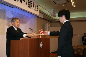 27年度のグループ合同入社式が八戸パークホテルに於いて行われました。三八五流通株式会社を含めグループ各社に採用になる新入社員へ各社長から辞令を交付され、泉山会長より社会人として立派に成長して下さいと激励をうけて新しくスタートしました。