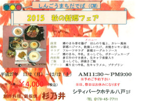 八戸市番町のシティパークホテル1Fの「杉乃井」では今回は新郷村の食材を使った料理をご用意しております。土曜日・日曜日を除いてあらかじめご予約下さい。