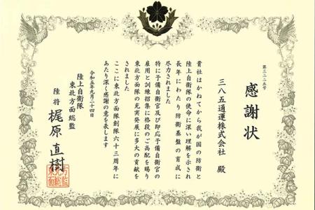 9月24日、三八五通運は、長年にわたり予備自衛官の雇用に貢献した功績が認められ、 陸上自衛隊東北方面総監 梶原直樹陸将より表彰を受けました。