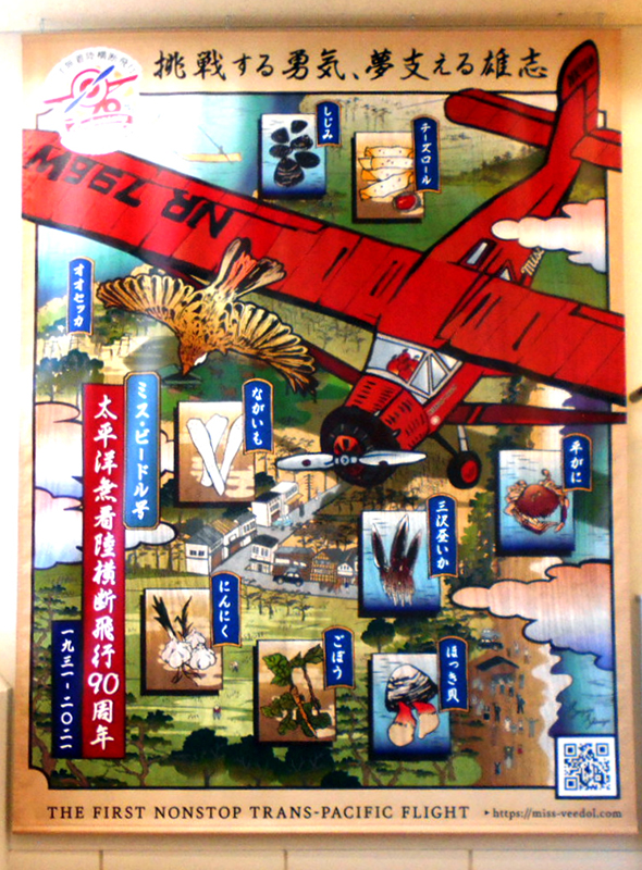 1931年10月、アメリカ人飛行士2人がミス・ビードル号で三沢の淋代海岸を飛び立ち、世界初の太平洋無着陸横断飛行に成功してから今年で90周年になることを記念し、 三沢空港の利用促進活動の取り組みの一つとして、三沢空港の中央階段壁面に縦4メートル、横3メートルの大型タペストリーが設置されました。
