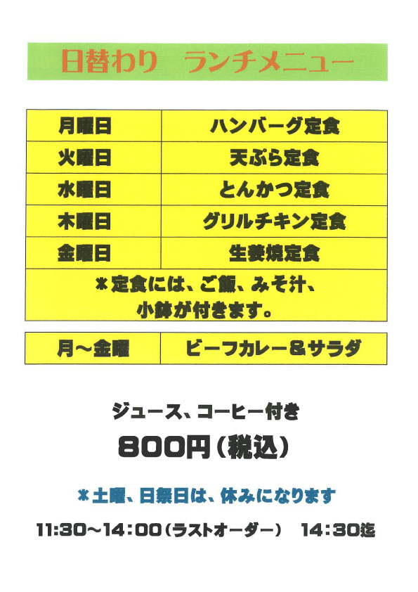 ハンバーグ定食などの日替わり定食の他、ビーフカレーセットをご用意しております。ジュース、コーヒー付きで800円(税込)とお得なセットです。
