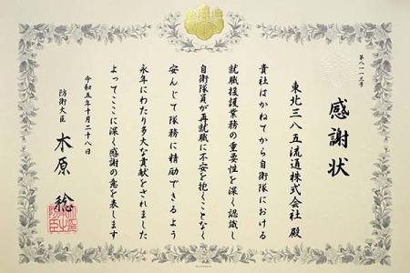 10月28日、東北三八五流通は、長年にわたり退職自衛官採用の就職援護に貢献した功績が認められ、 木原稔防衛大臣より感謝状を受けました。